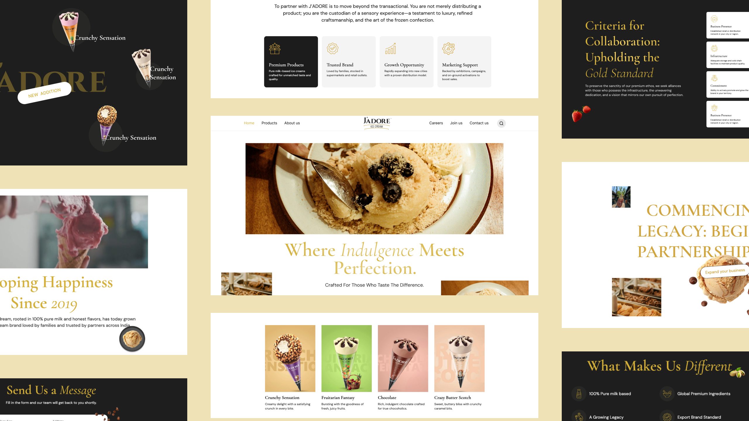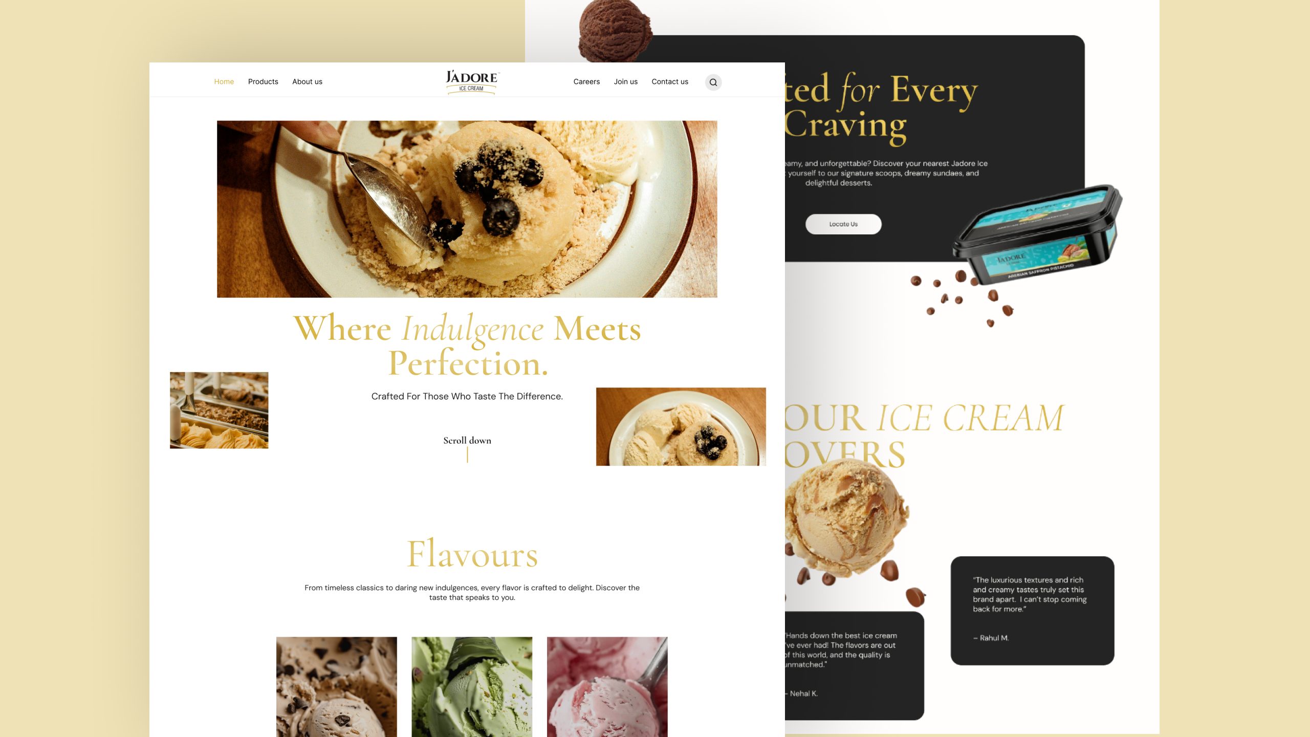 Jadore Ice Cream is a premium ice cream brand under the same group as Sheetal Food World. Inspired by its French name and positioning, the vision was to create a luxurious, indulgent digital experience that communicates depth of flavour, craftsmanship, and premium quality.